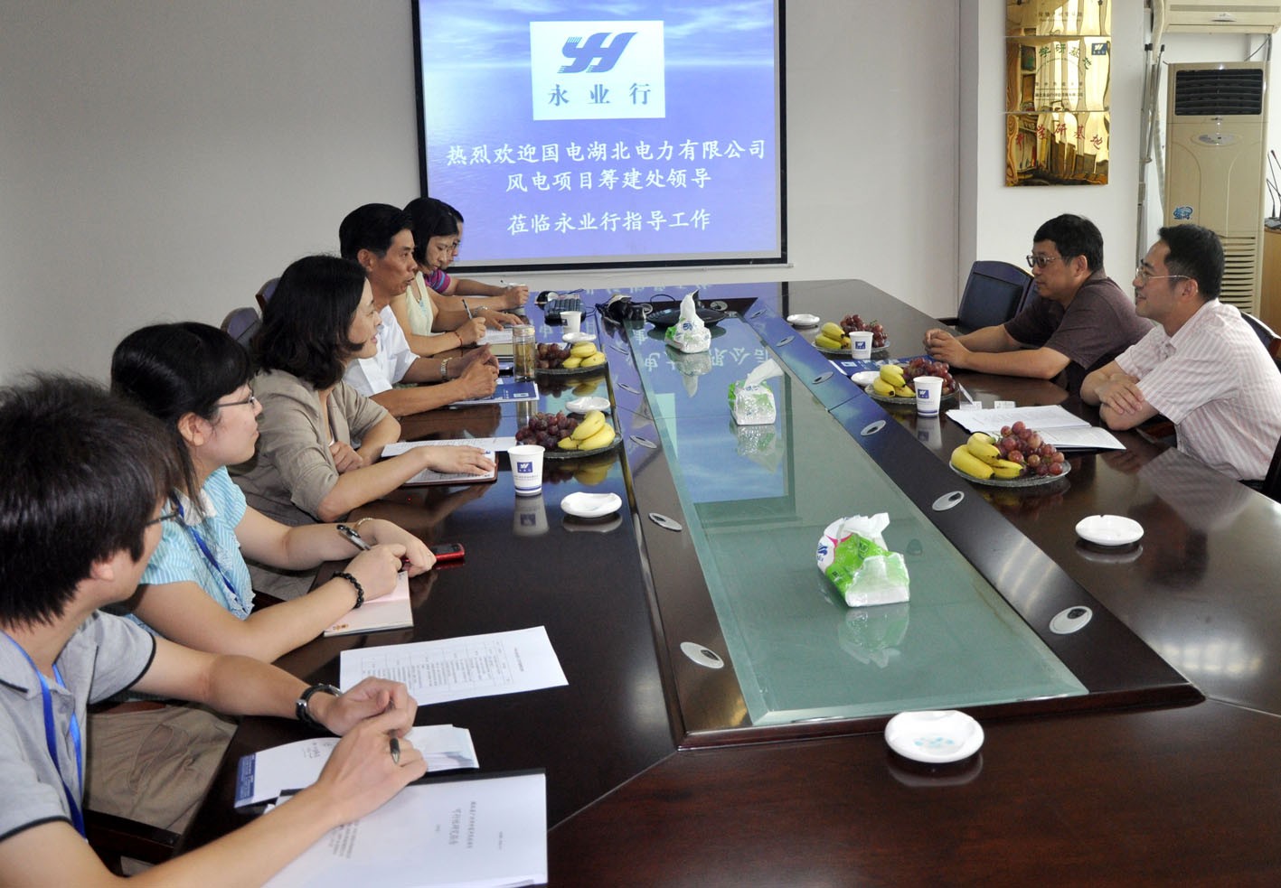 2012年8月17日,国电湖北电力有限公司有关领导莅临永业行考察 2012-08-17 8月17日,国电湖北电力有限公司风电项目筹建处副主任周峰、高级工程师季文莅临永业行考察交流。 永业行董事长方国成、助理总裁王琴、综合部负责人杨雪莲、地矿咨询一部副总经理王亮、国土事务部助理总经理吴品涵及高级经理冉超热情接待了周主任一行。集体观看永业行专题片后,方董向周主任等介绍了永业行的发展情况,国土事务部助理总经理吴品涵就双方合作项目的开展情况作了汇报。周主任对永业行技术人员开展的前期工作予以了充分肯定,并表示希望与永业行进一步拓展业务合作领域。 MORE